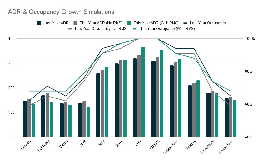 By increasing rates by 5% across the board, you risk losing business to competitors in some months and not compensating for that loss with a large enough increase in the high season. The decrease in occupancy could ultimately result in a decline in revenue year-on-year. An RMS is able to analyze current market dynamics to ensure rates are optimized for every single day of the year to remain competitive and to maximize revenue on days when demand is highest. This intricate balance between ADR and Occupancy is where an RMS can ultimately help you to maximize your revenue.