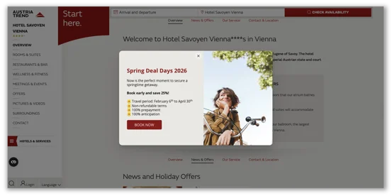 Savoyen greets visitors with a burst of seasonal energy the moment they land on the homepage. A vibrant welcome Layer announces “Spring Deal Days 2026,” inviting travelers to secure their getaway and enjoy an exclusive 25% spring offer.