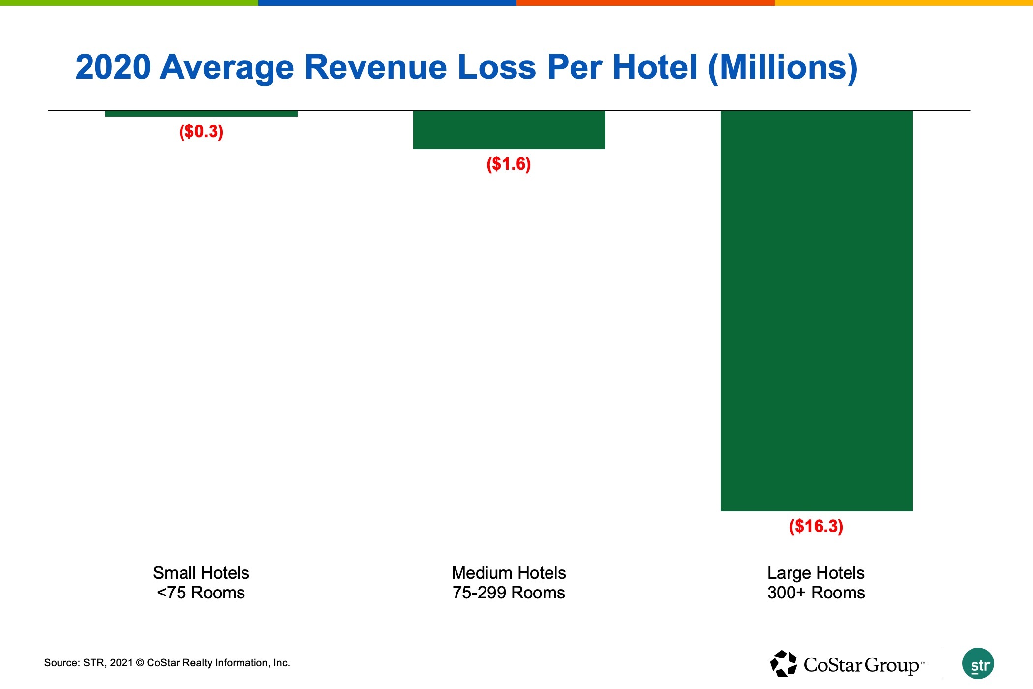 In 2020, the average U.S. hotel lost $1.4 million in rooms revenue via a drop of 7,400 room nights. Data from the U.S. Bureau of Labor Statistics estimates that at year end, hotels experienced a 34% drop in employment, among the largest decline of any sector. All, however, are not created equal, and the losses in revenues, demand, and employment have been centered in large hotels, those with 300-plus rooms.