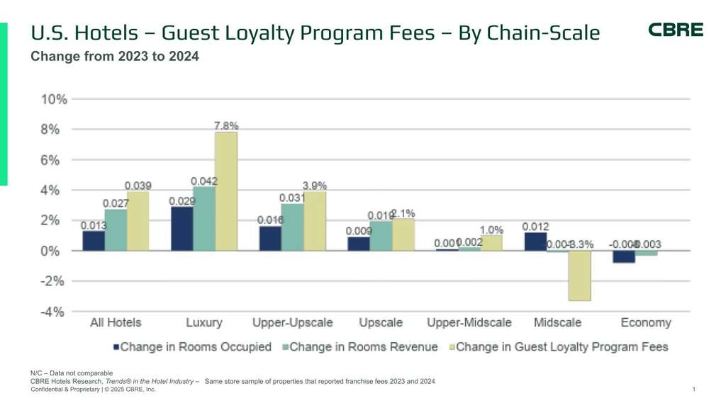 In 2024, loyalty program fees averaged 2.2% of rooms revenue and were highest at upper-upscale hotels. Properties that operate in this segment capture both corporate and group travelers, two types of frequent travelers that appreciate the benefits of the loyalty programs. Conversely, the loyalty program fee to revenue ratio is lowest at midscale and economy hotels, where guests are less likely to be loyalty club members.