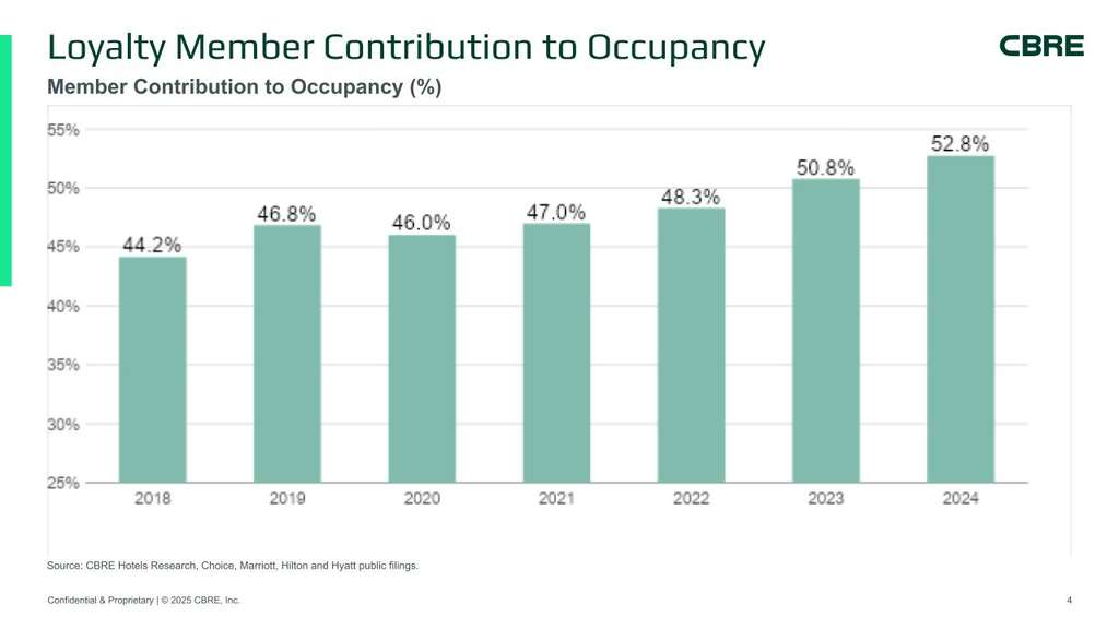 Loyalty member contribution to occupancy has been on the rise since the pandemic. In 2024, the average member contribution to occupancy rose two percentage points to 52.8% year-over-year. Loyalty programs provided 12% more room nights in 2024 compared to 2023, although the average room nights per member declined by 4% to 1.0 from 1.1, still below the recent peak of 1.8 in 2016. This dynamic suggests that members are either inactive, participating in multiple loyalty programs, traveling infrequently or accumulating points through credit card and affiliate partnerships instead of through frequent hotel stays.