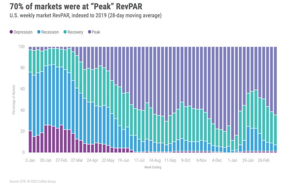 While Spring Break will continue through the second week of April, last week was likely the peak according to STR’s School Break Report. Sunday, 20 March 2022 had the second highest TSA security screenings since the start of the pandemic, the highest being the Wednesday before Thanksgiving 2021, which likely signifies people coming home rather than going on vacation. Given that travel volume, we expect demand will come down from the level seen last week but remain moderately solid through the remainder of Spring and then strengthen as we head into summer 2022.